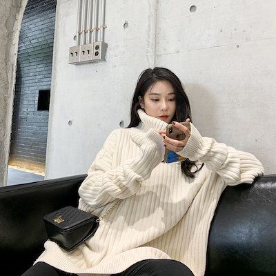 ブラウスハイネックセーターレディースミディアム丈厚手ゆったり外着秋冬新作けだるい風洋風白ボトムニットラブリータートルネックラウンドネックニットあったか!カシミヤタッチロンT ベーシックニット