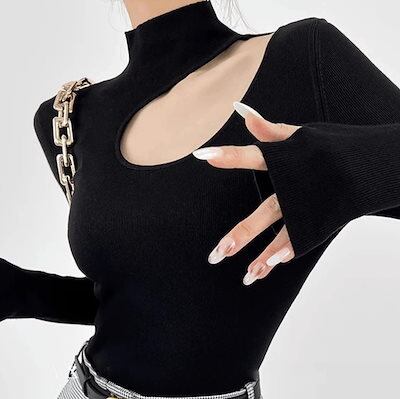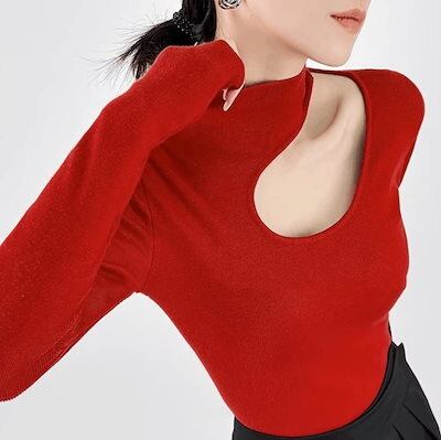 アシンメトリーカットアウトタートルネックセーター 赤 レッド 黒 ブラック ベージュ 白 ホワイト 韓国 オルチャン レディース 韓国レディーストップス 個性的トップス秋冬 アシンメトリートップス