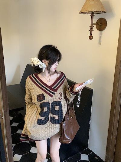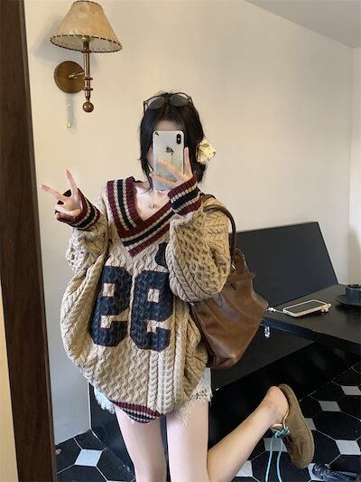 2024秋冬ニット ナンバーロゴ ケーブル編み 配色 Vネック オーバーサイズ トップス ヴィンテージ風 ルーズ 秋冬 レトロ 韓国ファッション レディース