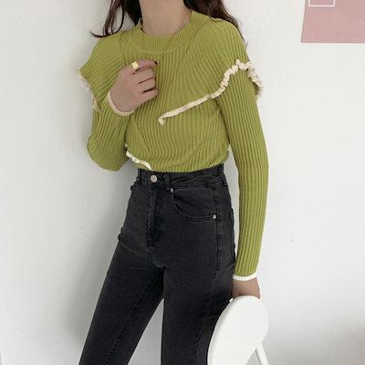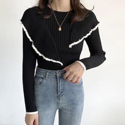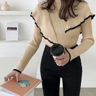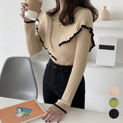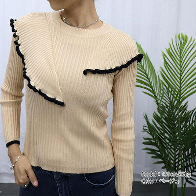 フレア リブニットトップス レディース モックネック ニットセーター フリルトップス長袖 秋冬 ニットソー スリムフィット
