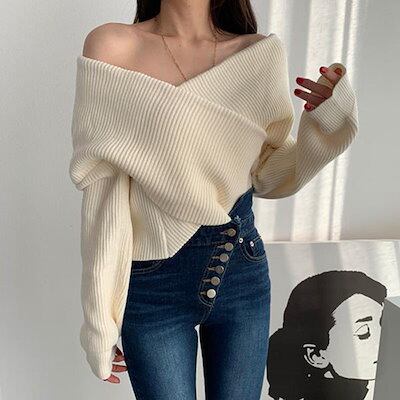 Vネックセーター ニットセーター オフショルダー オフショルニット 春秋風 長袖 ドロップショルダー 肩出し レディース 大人 レースアップ フェミニン 可愛い ざっくり編み リブニット ショート丈