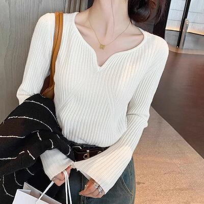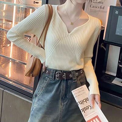 キーネック ニット リブニット トップス 長袖 レディース リブ フィット プルオーバー シンプル 無地 ニットトップス ニットセーター セーター タイト ストレッチ 柔らかい オフィスカジュアル 大