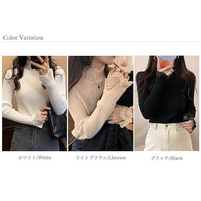 ニット 袖レース ハイネック トップス 長袖 レディース 重ね着風 レース フレア袖 レースニット ニットトップス リブニット 重ね着 フリルネック フィット ドッキング ニットセーター 袖長め 柔ら