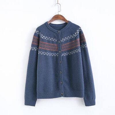 ラウンドネック ニットカーディガン ショート丈 カーディガン カジュアル 体型カバー レディース ノルディック柄 丸首 大きめ 幾何学 アーガイル 前開き アウター おしゃれ 秋冬 大きいサイズ お洒