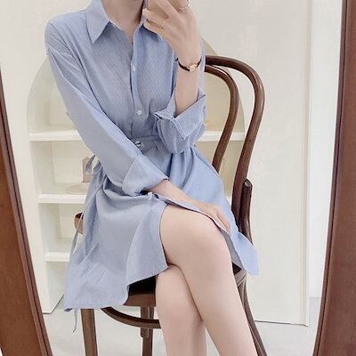 シャツワンピース レディース ワンピース ショート丈 シャツワンピ ストライプ 長袖 ワンピ おしゃれ ブルー ベスト付き きれいめ ゆったり