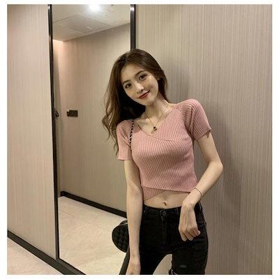 プルオーバー サマーニット カシュクール きれいめ カットソー vネック 半袖 セーター トップス クロス リブ編み 女性
