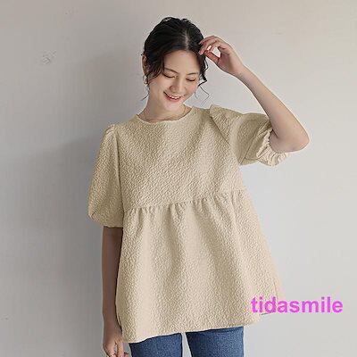 カットソー レディース ブラウス Tシャツ 半袖 tシャツ パフスリーブ エンボス加工 ペプラム バッグリボン トップス 夏服 着痩せ おしゃれ