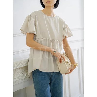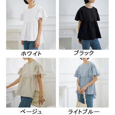 ブラウス レディース フリル袖ペプラムブラウス 半袖 トップス 夏 ゆったりシャツ プルオーバー 丸首 無地 前後差 ギャザー 着痩せ 体型カバー かわいい 大人