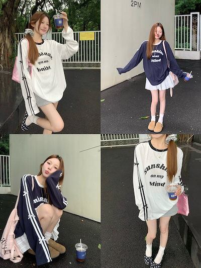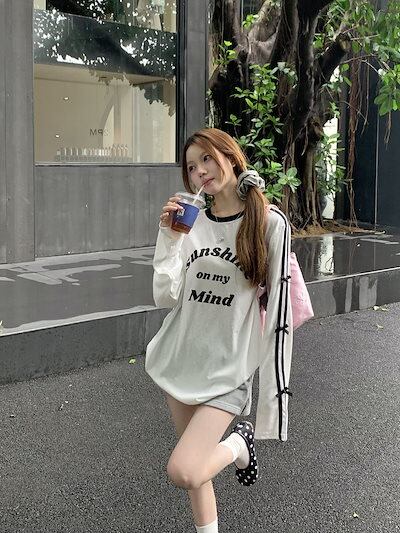 2024 秋冬 tシャツ レタープリント ロンt サイドトップス 長袖 レトロ 韓国ファッション系袖 レディース 大人可愛い シルエット サイズ
