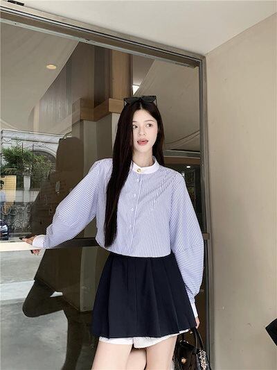 2024秋冬トップス シャツ 長袖 ストライプ ボタン 襟 スタンダードカラー 秋 青 ブルー おしゃれ かわいい 韓国ファッション レディース お出かけ