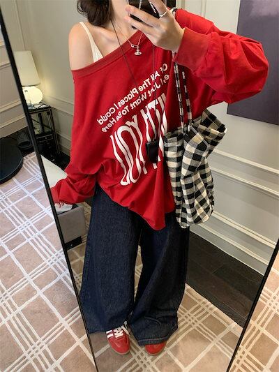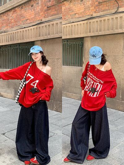 2024 秋冬 トップス 長袖 かわいいラウンドネック Tシャツ 肌見せ レディース ストレート 韓国風ルーズゆったりカジュアル おしゃれサイズ シルエットファッション系コーデ衣装上下セットアップ