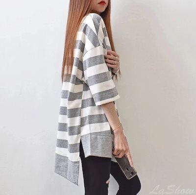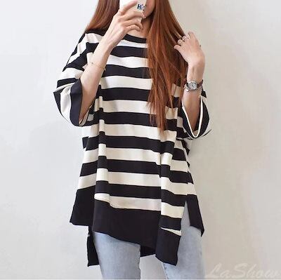 七分丈袖Tシャツボーダーレディース不規則裾スリット入りスウェット韓国ファッショントレーナーゆったり長袖Tシャツスウェット パーカートップスTシャツ
