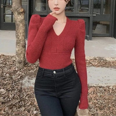 ベーシックニット 韓国版秋冬新作優しくて甘いVネックスリムスリムスリムスリムでモチモチした純欲風ニットバブル袖セーター女