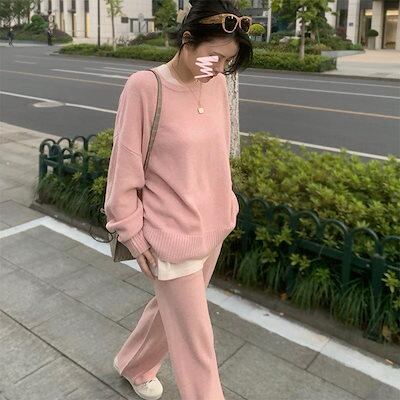 セットアップ レディース 秋冬 ニットセーター ワイドパンツ プルオーバー 上下セット 通勤 カジュアル 長袖 ゆったり 厚手 クールネック お洒落