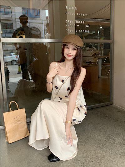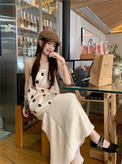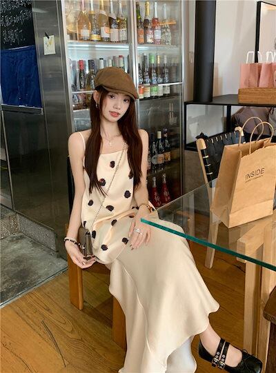 2024 春夏トップス キャミソール ノースリーブ スクエアネック ドット柄 丈長め ゆったり 細見え 夏 白 ホワイト おしゃれ かわいい 韓国ファッション レディース お出かけ