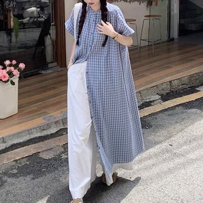 2024 春夏ワンピース シャツ ギンガムチェック柄 ラウンドネック 半袖 ボタン ミモレ丈 Aライン ゆったり 細見え 夏 青 ブルー カジュアル おしゃれ かわいい 韓国ファッション レディース