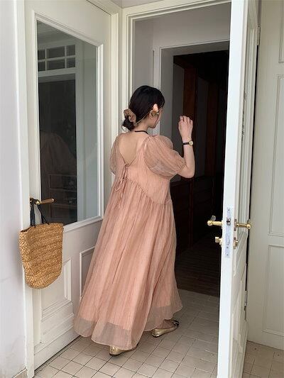 2024 春夏ワンピース ロング丈 半袖 バブル袖 バックオープン Aライン リボン ゆったり 細見え 夏 黄色 カジュアル おしゃれ かわいい キュート 韓国ファッション レディース お出かけ