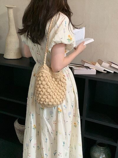 2024春夏ワンピース ロング丈 Vネック 半袖 バブル袖 花柄 Aライン リボン ゆったり 細見え 夏 カジュアル おしゃれ かわいい キュート 韓国ファッション レディース お出かけ