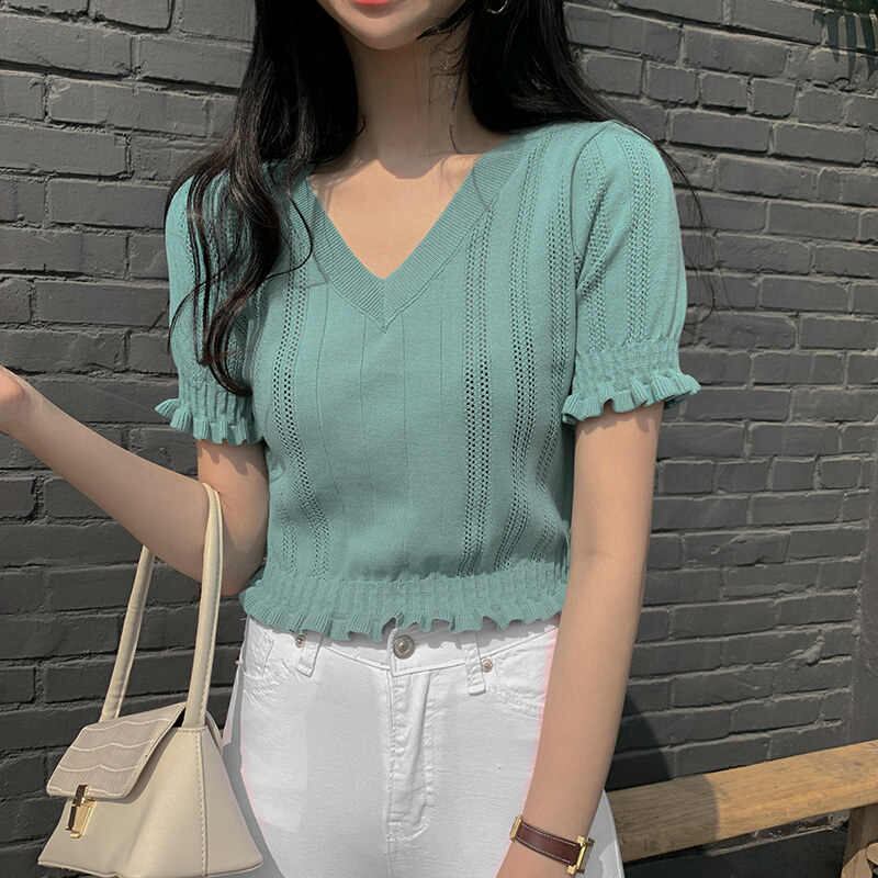 レディースカットソーVネック半袖サマーニットシンプル無地トップスカジュアルキュート大人可愛い大人女子