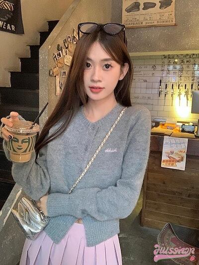 トップス レディース ノーカラー 長袖 ショート丈 ニット カーディガン グレー セーター 羽織 秋 リブニット リブ編み カジュアル 可愛い おしゃれ シンプル 韓国