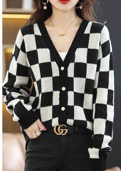 ニット レディース カーディガン トップス 長袖 チェック柄 Vネック カットソー 厚手 オフィス アウター 大きいサイズ ゆったり カジュアル 黒 春 冬 秋