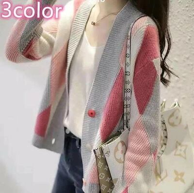 ニット レディース カーディガン トップス 配色 几何柄 長袖 Vネック カットソー 厚手 オフィス アウター 大きいサイズ ゆったり カジュアル 黒 春 冬 秋