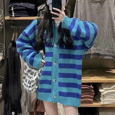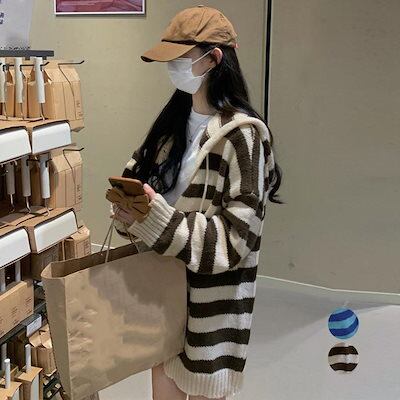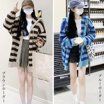 ボーダー柄ニットカーディガン 韓国羽織り ニットカーディガン レディース アウター 秋冬 新作 ミディアム丈 羽織り ゆったり