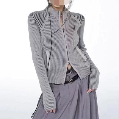 ニットカーディガン アメリカンスパイスガールズレトロストリートカーディガンジャケットダブルヘッドジップ刺繍ニットセーター糸スリムジャンパーレディース