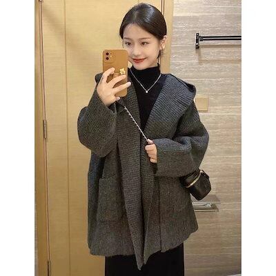 韓国ファッション 厚手 セーター フード付きアウター レディース ゆったり 百掛け ニットカーディガン トップス 長袖ニット