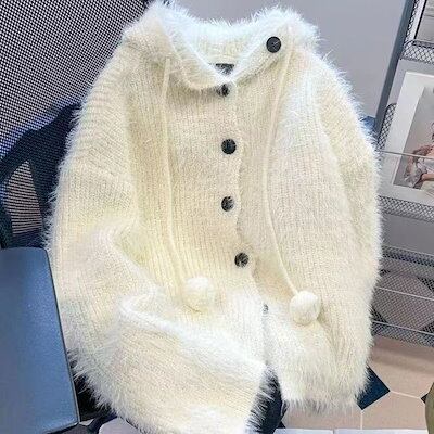 甘く優しい フード付き セーター カーディガン レトロ 百掛け 無地 アウター 長袖ニット レディース ゆったり 厚手 ニットトップス