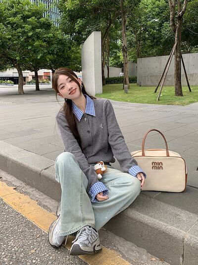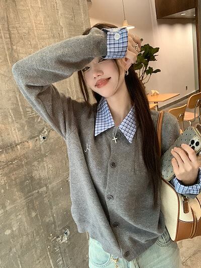 2024 秋冬フェイクレイヤード ニット トップス チェック柄 刺繍ロゴ トップス 長袖 レトロ 韓国ファッション レディース