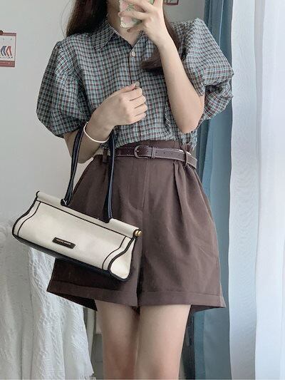 涼しく楽ちんセットアップ 夏服 セットアップ ジャージ 上下セット半袖 レディース 新作2点セットサマーレトロゆったり格子バルーンスリーブシャツ+ハイウエストワイドパンツ レディース 韓国ファッション