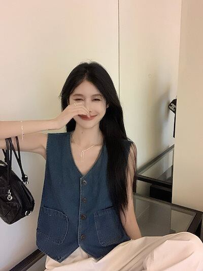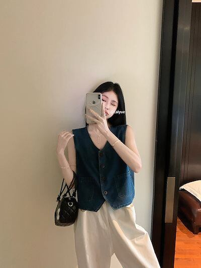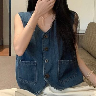 2024春夏トップス ベスト デニム生地 Vネック ノースリーブ ボタン ゆったり 細見え 夏 青 ブルー おしゃれ かわいい 甘め キュート ラブリー 韓国ファッション レディース お出かけ