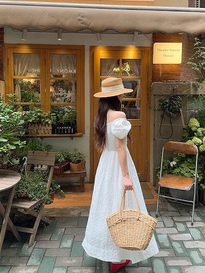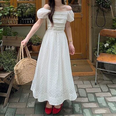 2024春夏ワンピース 半袖 ロング丈 オフショルダー スクエアネック Aライン フレア ゆったり 細見え 夏 白 ホワイト おしゃれ かわいい 甘め キュート ラブリー 韓国ファッション レディース
