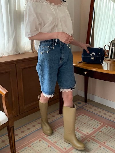 2024 春夏パンツ ハーフパンツ デニム ジーンズ ワイド レース リボン ハイウエスト 美脚効果 脚長効果 細見え 夏 おしゃれ かわいい 韓国ファッション レディース お出かけ