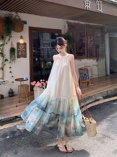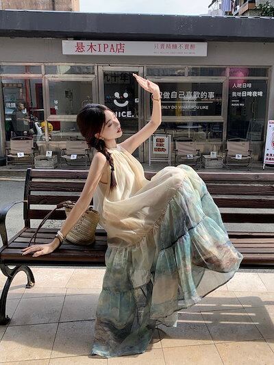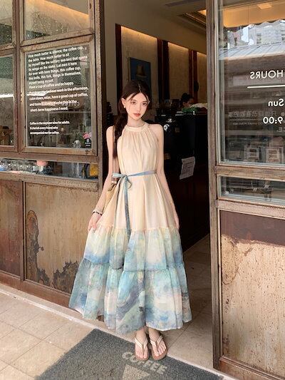 2024夏 韓国ワンピース ドレス ホルターネック ノースリーブ ロング丈 Aライン ゆったり 細見え 夏 青 ブルー きれいめ おしゃれ かわいい 韓国ファッション レディース お出かけ