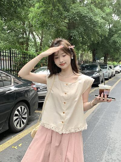 2024 春夏 甘い トップス Tシャツ ラウンドネック丈 休日 フレンチ 韓国 ブラウス ファッション系 タイト スリムフィット丈短め ショート レディース へそ出し 休日 おしゃれ T