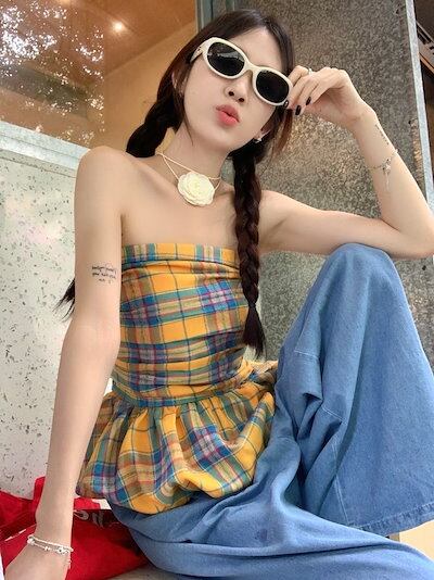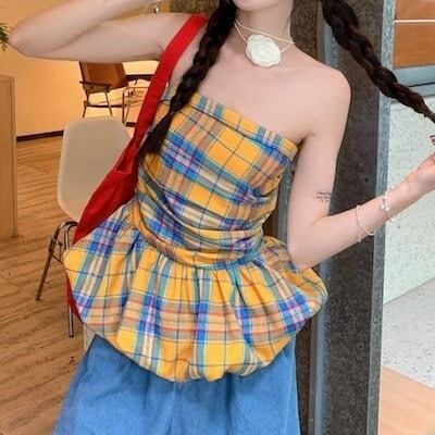 2024夏 韓国トップス シャツ チェック ノースリーブ スリム 細見え 夏 黄色 イエロー カジュアル おしゃれ かわいい 韓国ファッション レディース お出かけ