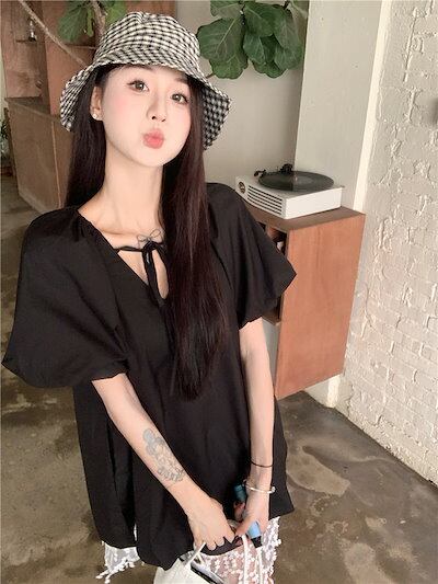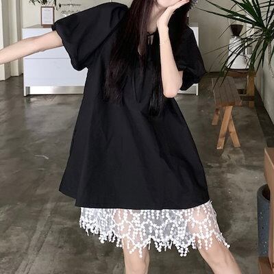 2024 春夏ワンピース 膝丈 レース Vネック 半袖 Aライン ゆったり 細見え 夏 黒 ブラック カジュアル おしゃれ かわいい キュート 韓国ファッション レディース お出かけ