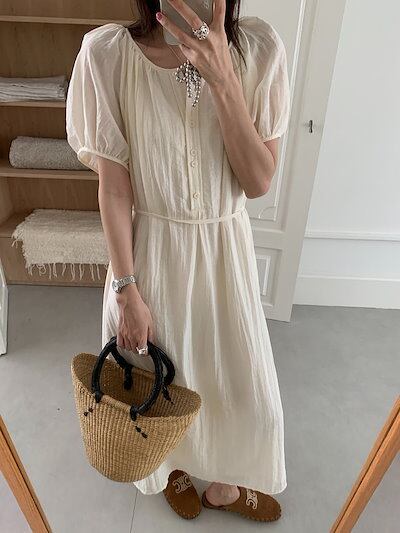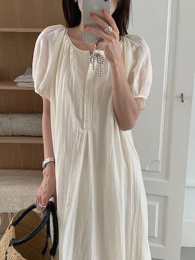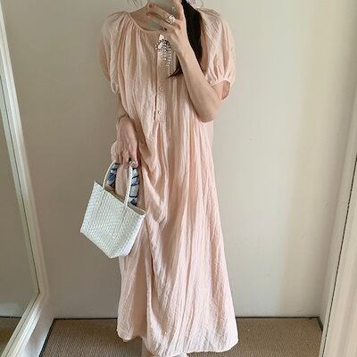 2024 春夏ワンピース ミモレ丈 半袖 バブル袖 ラウンドネック Aライン リボン ゆったり 細見え 夏 カジュアル おしゃれ かわいい キュート 韓国ファッション レディース お出かけ