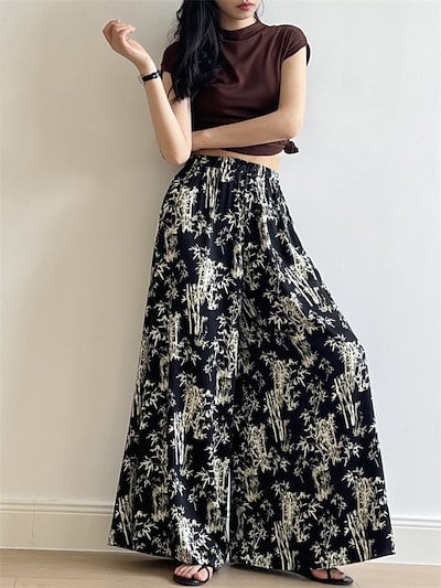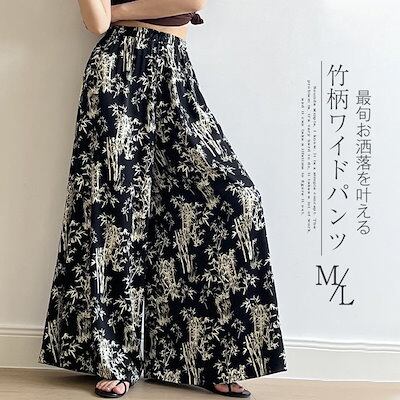 ワイドパンツ ひんやり 竹柄パンツ レディース 夏 フレアパンツ 涼しい ガウチョパンツ ロングパンツ リゾート 花柄 バギーパンツ 大きいサイズ ゆったり シフォン リラックス ビーチ 海 爽やか