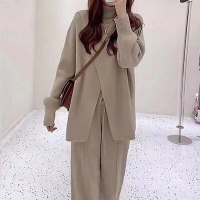 秋冬 ファッションセットアップ おしゃれ 気質 レディース ニット アウター 二点セット 上下セット セーター ワイドパンツ セットアップ 通勤 シンプル 福袋