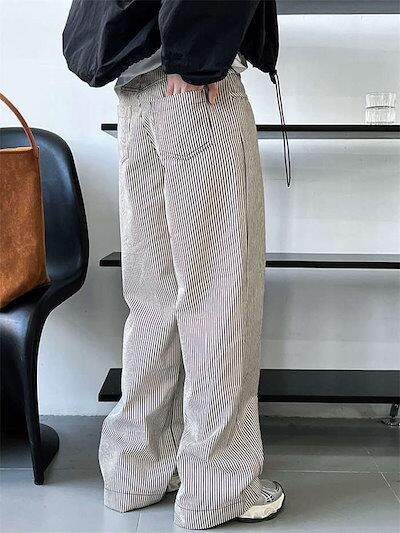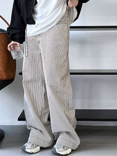 パンツ ワイドパンツ レディース ストライプ柄 春 秋 冬 長ズボン ロング丈 チノパンツ ポケット付き タックパンツ シンプル 柄パンツ 綿 コットン ゆったり 体型カバー ボトムス ストレート 個