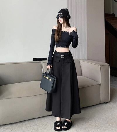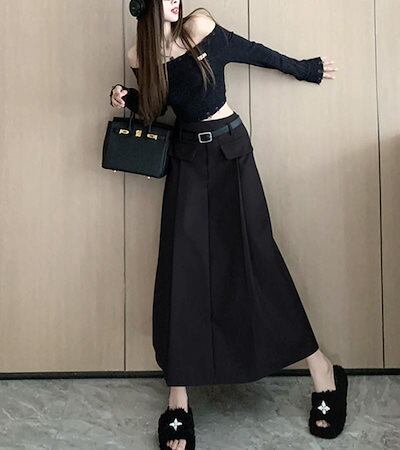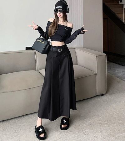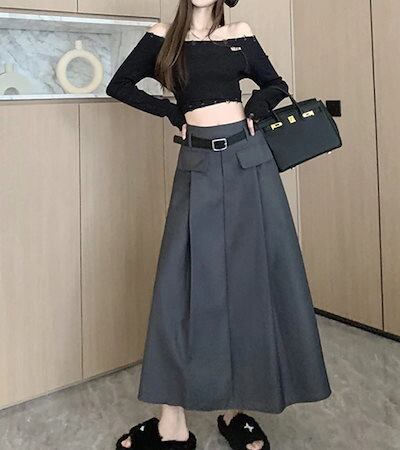 2024 春秋 ベルト付き ロング丈スカート セミ ハイウエスト ロングスカート スタイルアップ カジュアルフレンチきれいめシズニック