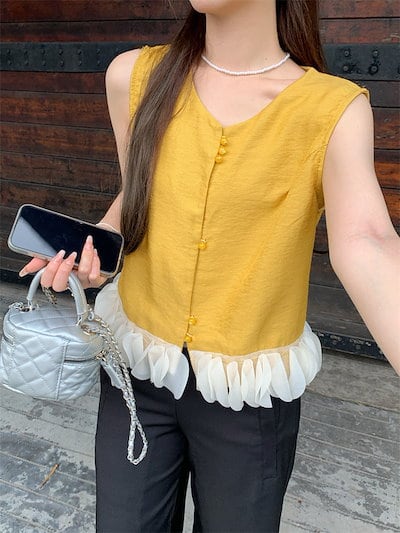 2024 春夏トップス シャツ ノースリーブ ボタン ラウンドネック フリル ゆったり 細見え 夏 黄色 イエロー おしゃれ かわいい 韓国ファッション レディース お出かけ