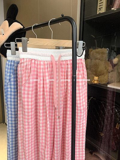 2024 春夏パンツ ロング丈 モップパンツ ギンガムチェック ワイド ストレート ウエストゴム ハイウエスト 美脚効果 脚長効果 細見え 夏 青 韓国ファッション レディース かわいい おしゃれ カ