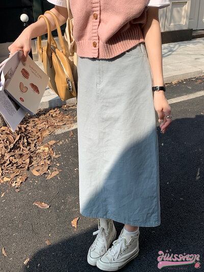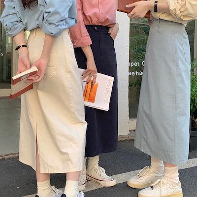 スカート デニム生地 ミディアム丈 スリット バックオープン ハイウエスト 脚長効果 美脚効果 細見え 春 白 水色 紺色 かわいい おしゃれ カジュアル 韓国ファッション レディース お出かけ