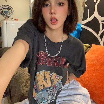 2024 夏 韓国 甘い トップス Tシャツ ラウンドネック 休日 ファッション サイズスリムフィット加工風丈短め ショート カットソー シルエット レディース 韓国系 休日 おしゃれ T