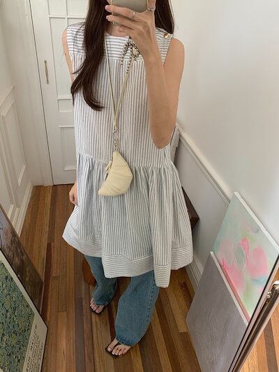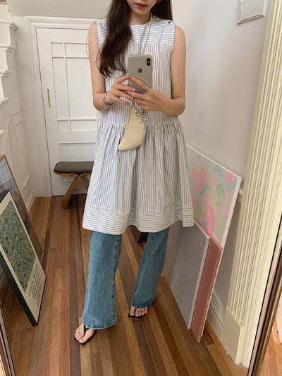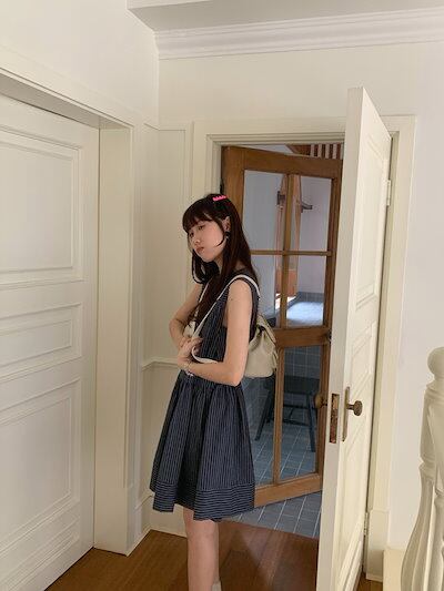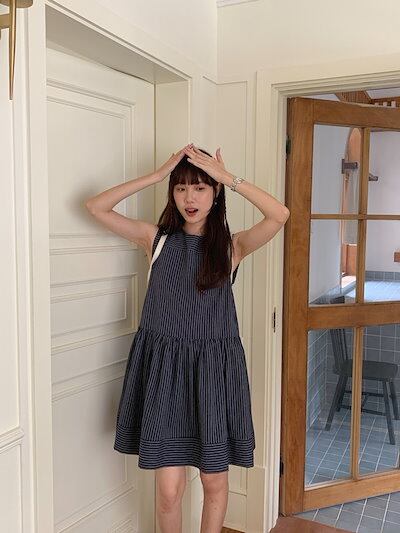 2024 夏 韓国ワンピース ミニ丈 Aライン ストライプ ラウンドネック ノースリーブ ハイウエスト 美脚効果 脚長効果 細見え 夏 おしゃれ かわいい キュート ガーリー 韓国ファッション レディ
