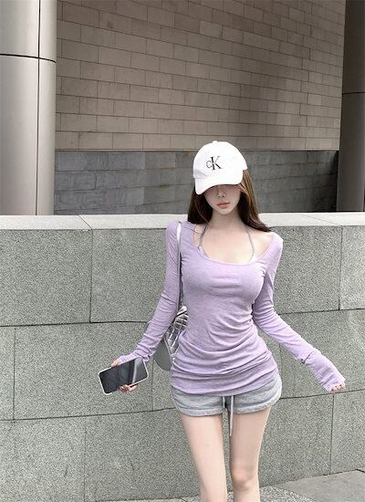 2024 秋冬tシャツ スリムフィット ロンt 薄手 Uネック 無地 トップス 長袖 シンプル レトロ 韓国ファッション レディース 大人可愛い ガーリー